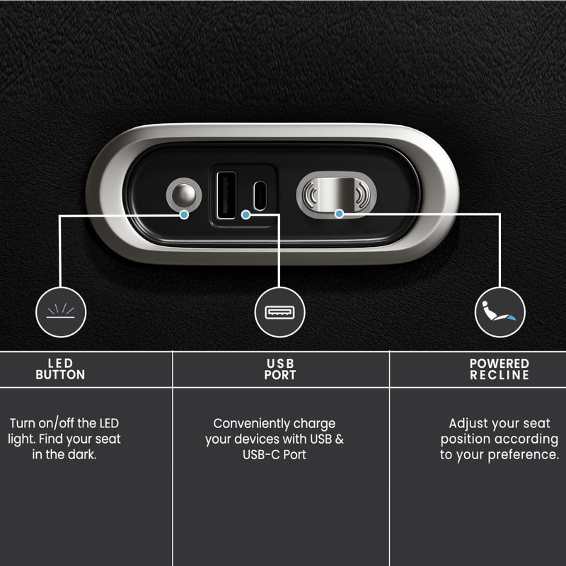 Personalize your seat with our exclusive accessory dock. Choose from a wide selection of lifestyle add-ons—swivel tables, wine glass holders, phone and tablet mounts, LED reading lights, snack bowls, and more. It’s the ultimate way to create the “best seat in the house.