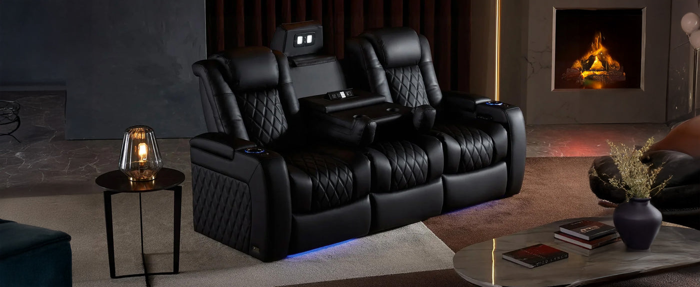 Clean lines, soft Nappa surfaces, and black-chrome details fit any modern media room. Whether you’re watching a blockbuster, gaming with friends, or lounging with a drink, the Multimedia Series turns comfort into control—your own personal cockpit of entertainment.
