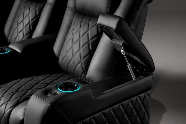 Hidden armrest storage that is powered by air pistons for a smoother open & close experience. Hide away your trays, remotes and tablets and have them accessible to you always.