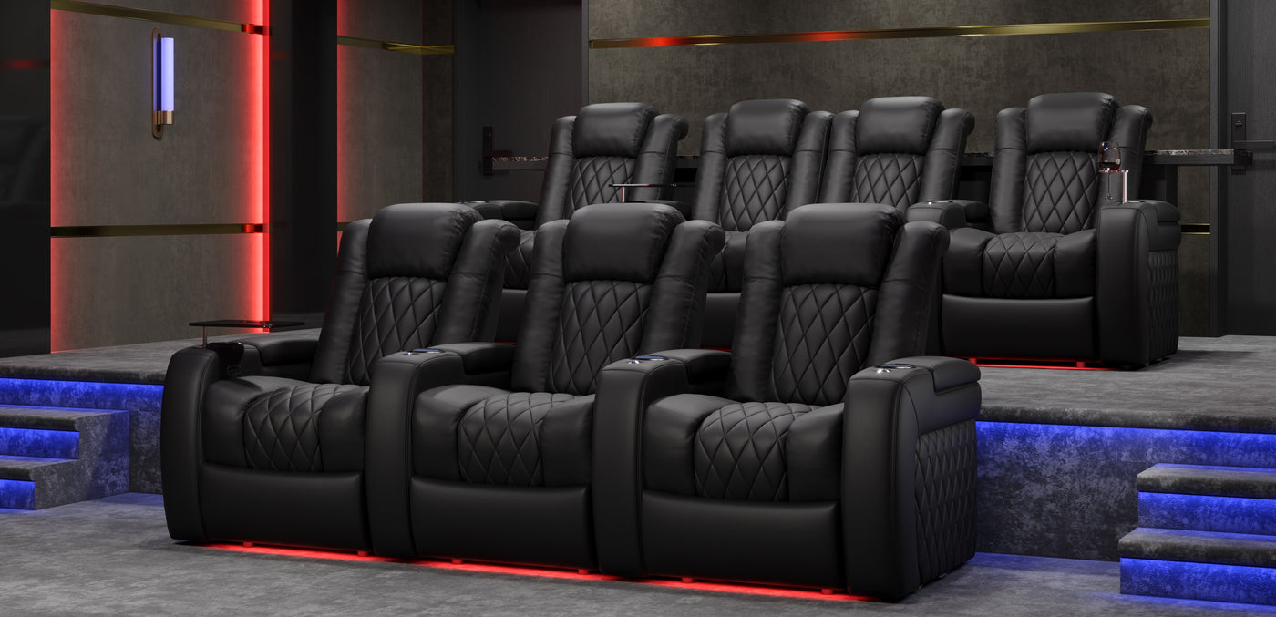 Stylish black chrome cupholders enhance your seating with a refined, modern touch—functional elegance for every movie night.