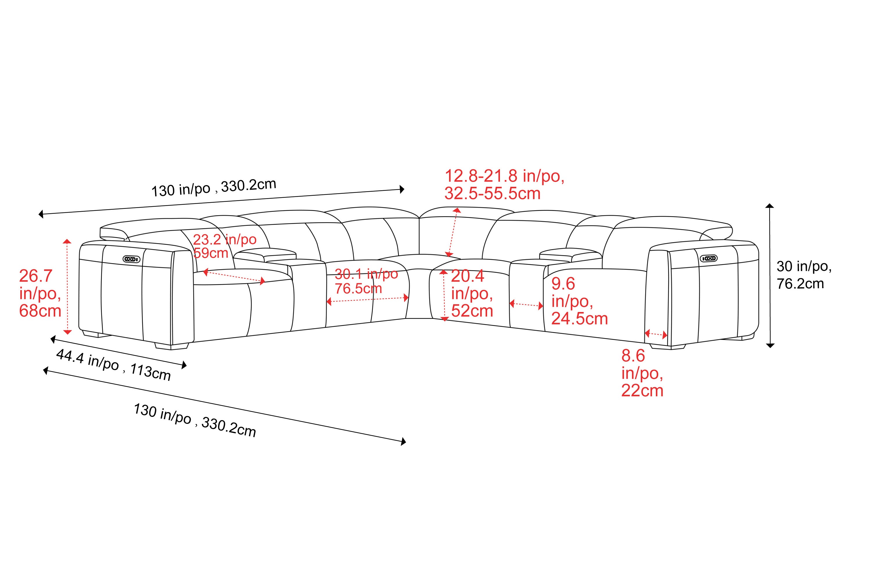 Width: 330.2 cm, Height: 76 cm, Depth: 330.2 cm