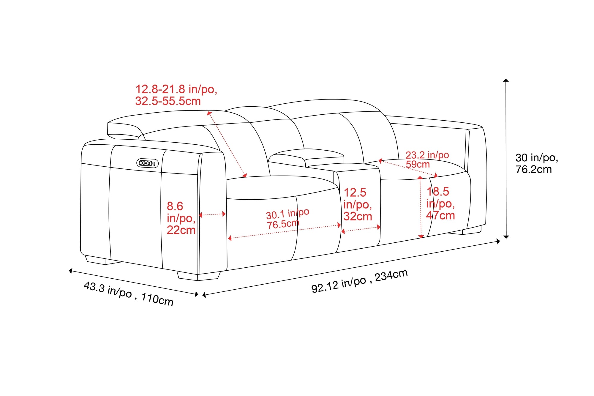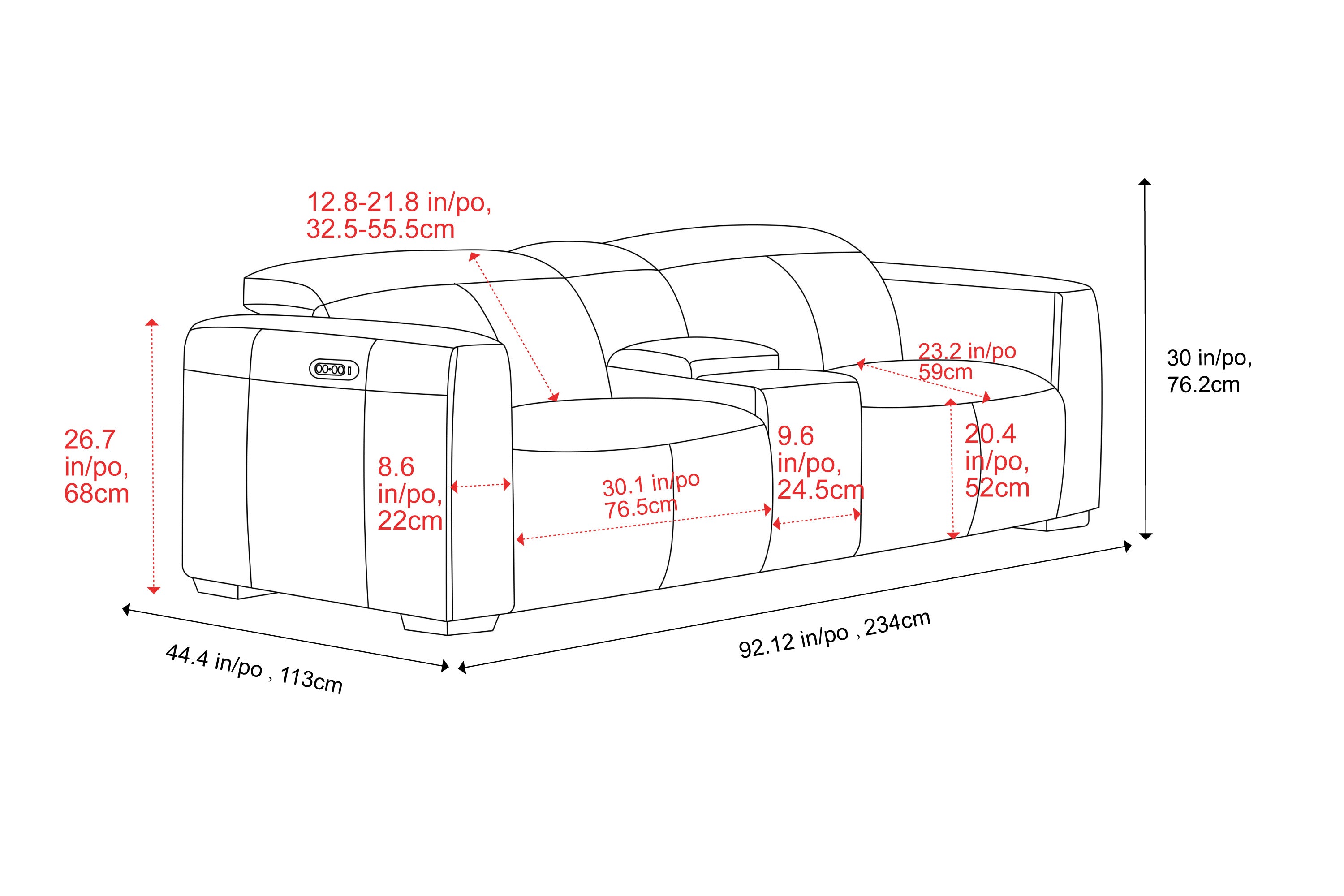 Width: 233.98 cm, Height: 76.2 cm, Depth: 114.3 cm