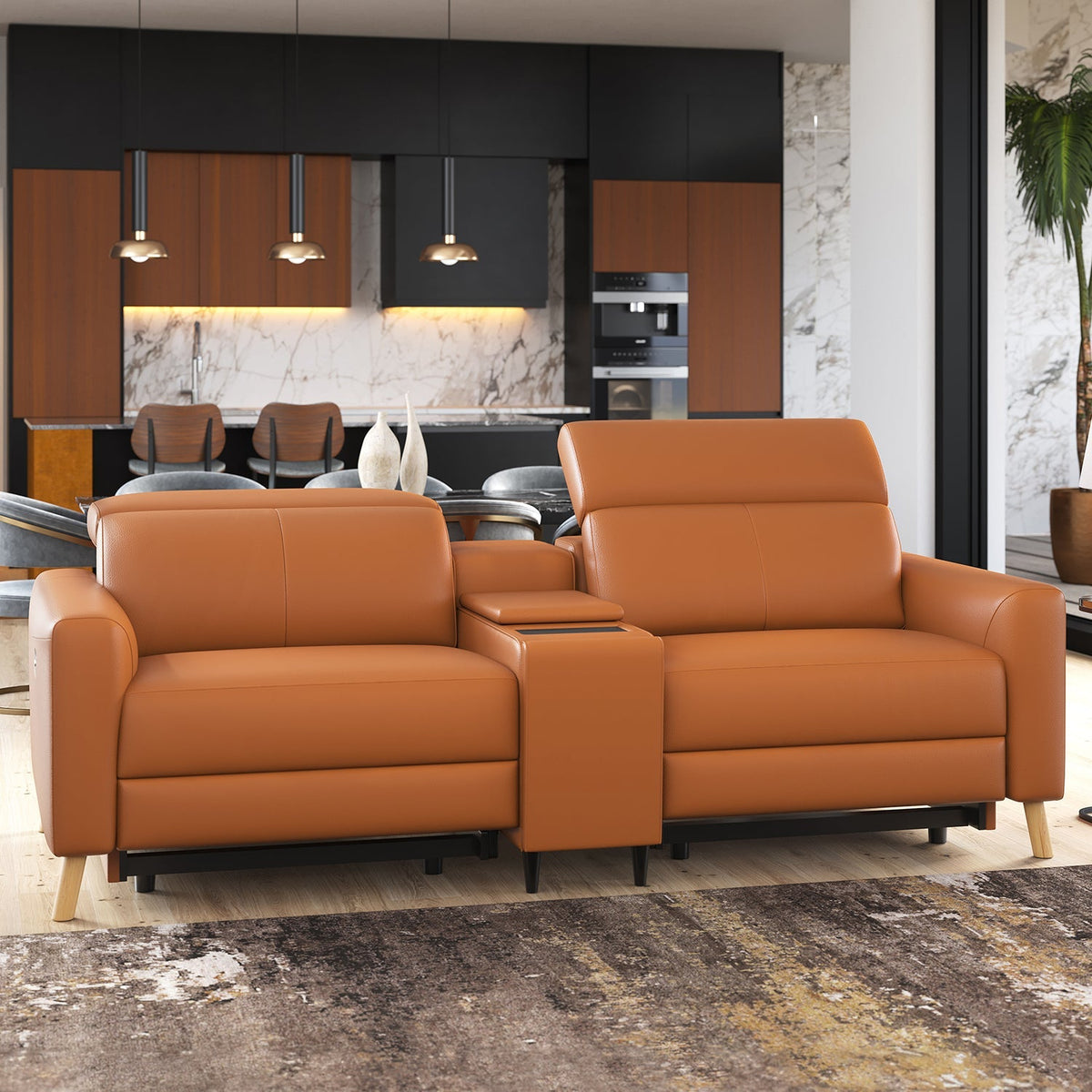 Introducing the Elodie Leather Loveseat with Console Lounge, where style meets innovation and comfort. This contemporary piece features Italian Nappa 11000 Top Grain Leather on all seating surfaces, offering a blend of style and practicality. Dive into relaxation with adjustable manual headrests and seamless electric recliners discreetly nestled within the sleek design. Engineered with an upscale Kiln-Dried Hardwood frame, it combines style and stability. Enjoy ultimate comfort with a supportive base suspension, high-density cushions, cup holders, and convenient USB charger controls, granting individual adjustments for reclining and headrests. Experience sophistication and indulgence at its finest with the Elodie Leather Lounge.