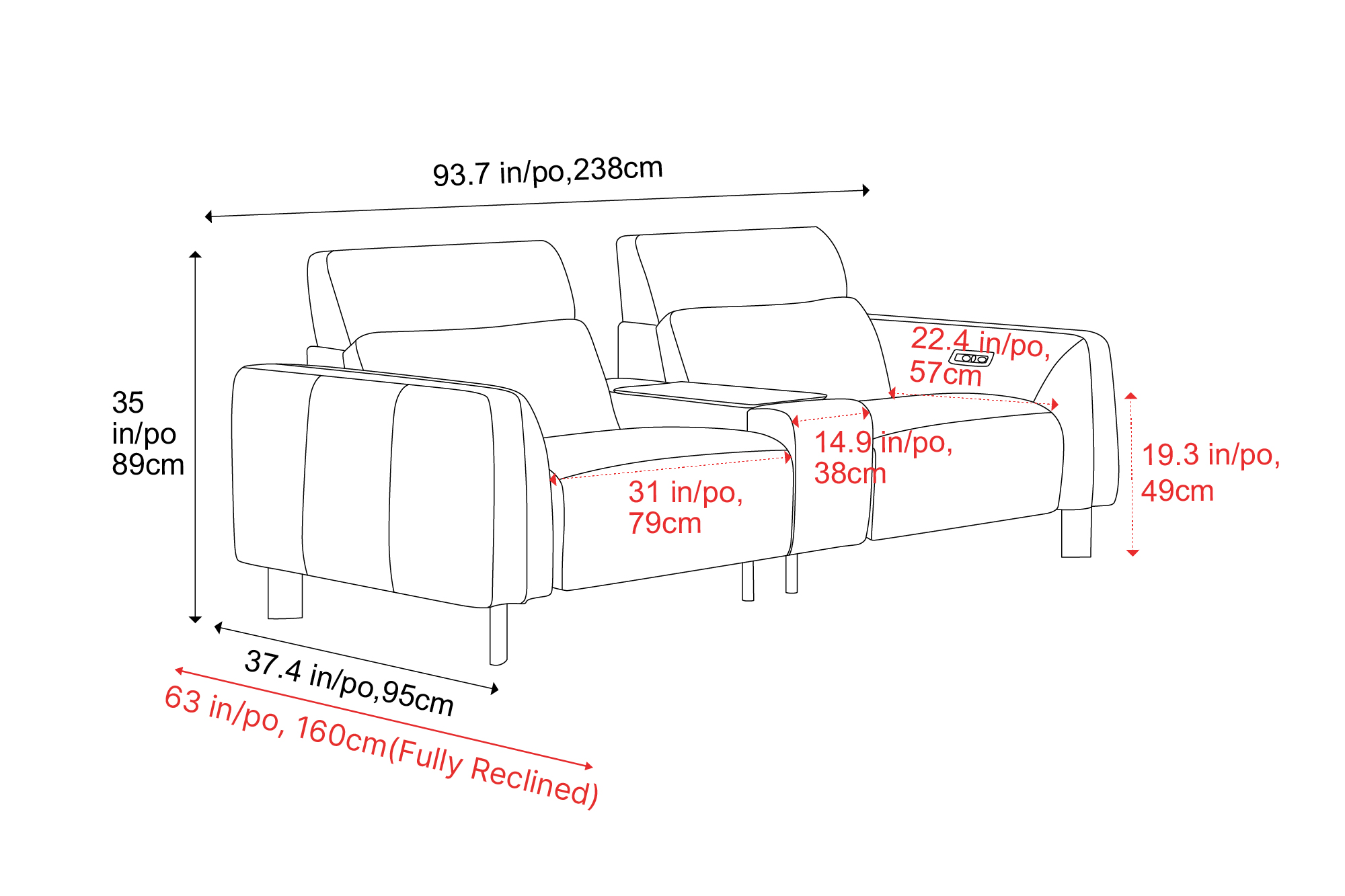Recliner Sofa with Console Dimension