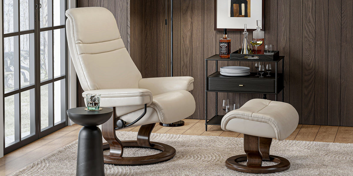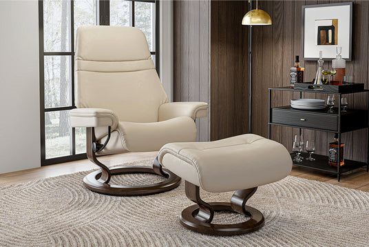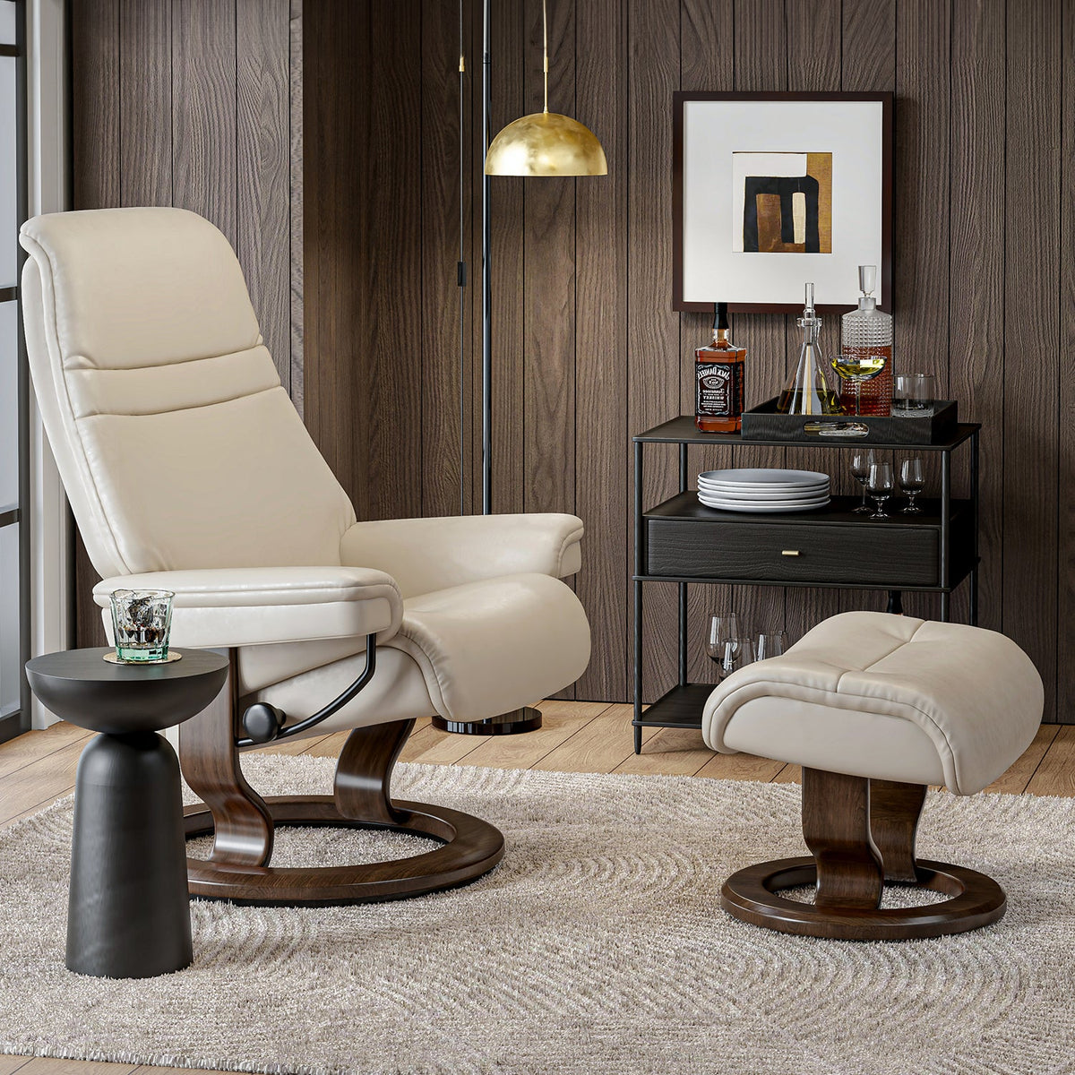 Relax in style with the Massimo reclining chair and its matching ottoman. Crafted with Italian Nappa 11000 Top Grain Leather in all the seating surfaces, this set exudes luxury. In a chic beige hue, it adds modern flair to any space. Supported by hardwood and metal, it offers both elegance and durability. Sink into the high-density foam cushions after a long day, knowing the no-sag suspension ensures lasting comfort. With the Massimo, enjoy both style and relaxation in your home.