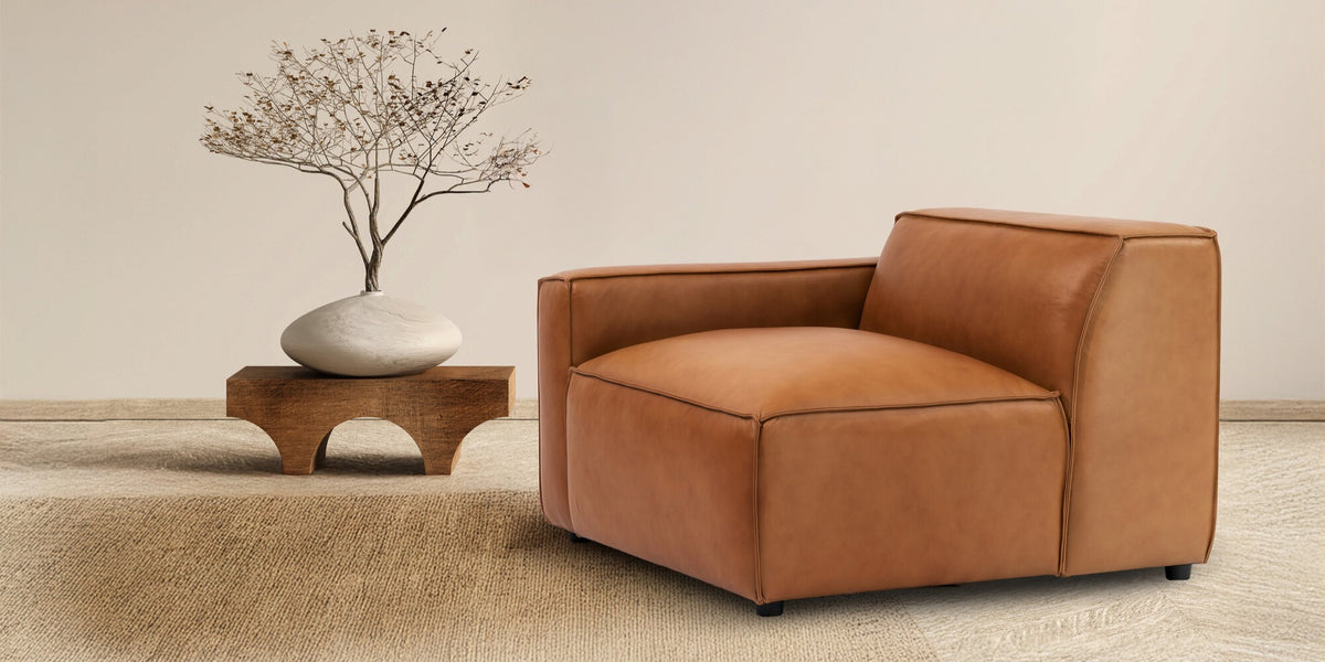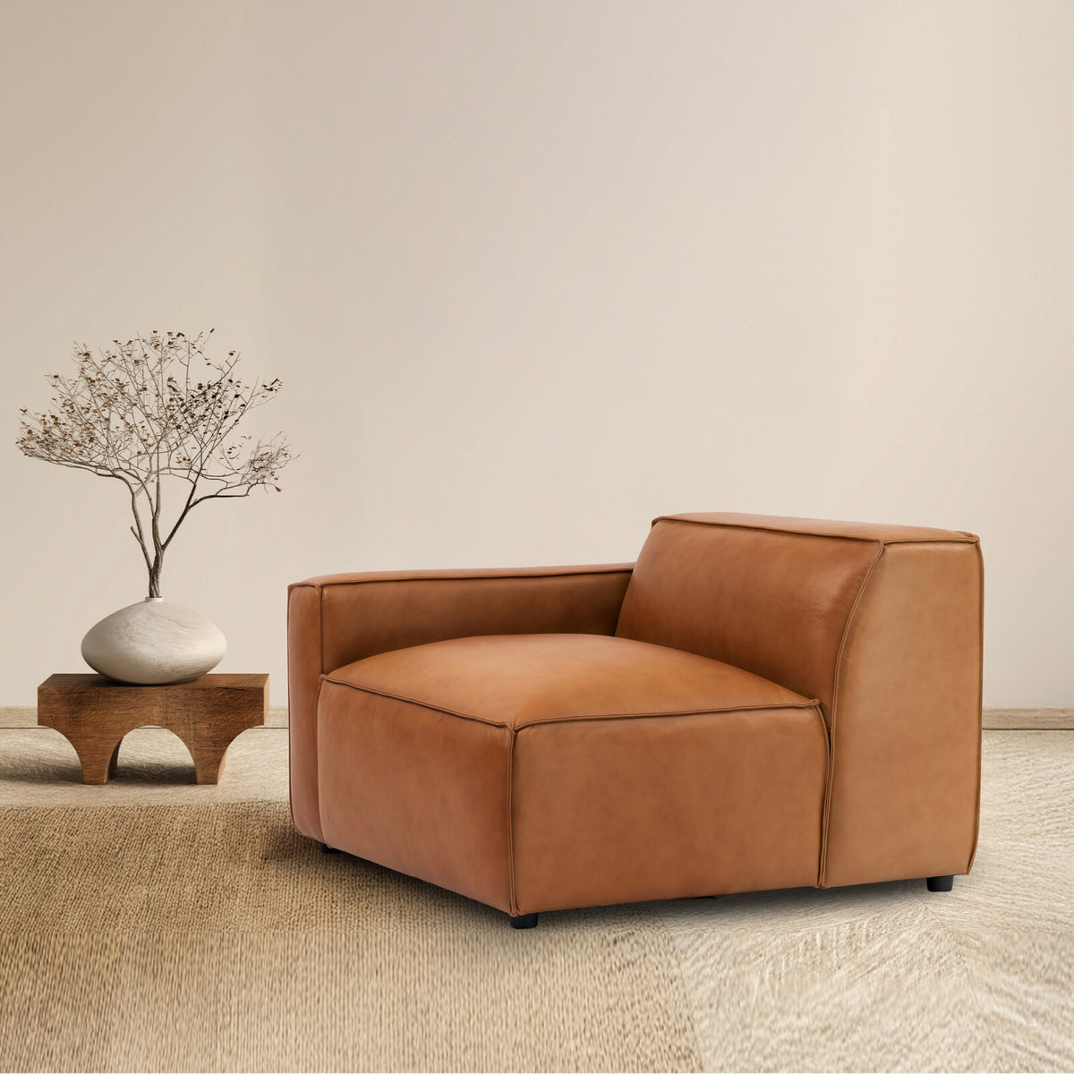 Introducing Nathan Leather Left Arm Sofa Module - the perfect addition to any décor. With its classic design, luxurious full aniline leather upholstery, and comfortable semi-firm seats, you can snuggle up and enjoy the plush feather padding while lounging peacefully. Customize your configuration by adding individual pieces from the same collection.