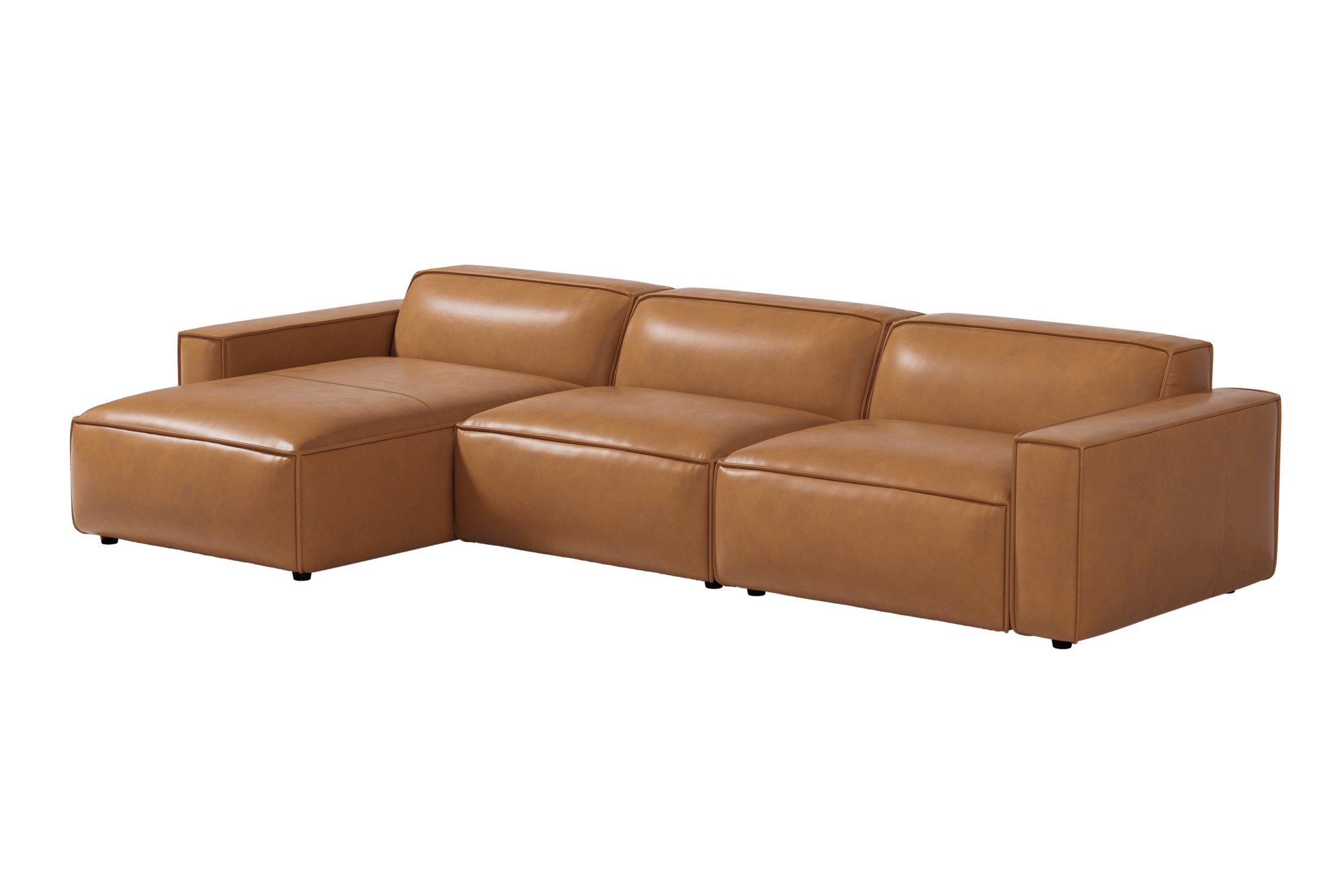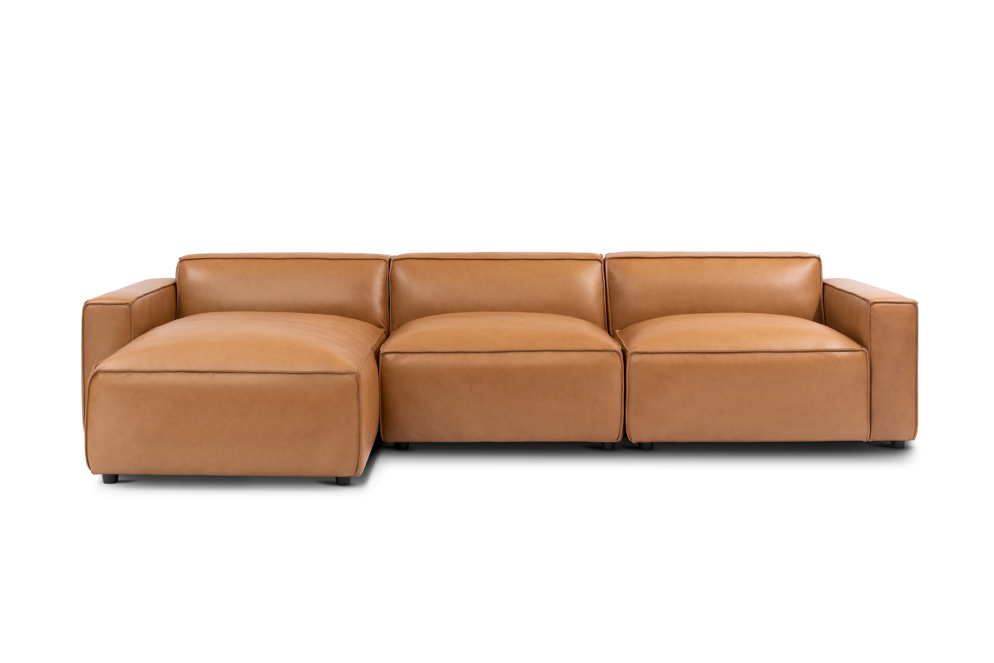 Create the perfect lounging space with the Nathan Leather Modular Sectional Lounge set—a classic design crafted from high-quality full aniline leather that complements any décor. The semi-firm seats offer unbeatable comfort, while the versatile design allows for peaceful lounging. Customize your seating arrangement by adding individual pieces to the three-piece set. With a structure made of solid and reinforced multilayer wood and high-resilience polyurethane foam for comfort. The medium-firm seat set is finished on all sides. This masterpiece is slightly treated to maintain its natural characteristics, but avoid exposing it to direct sunlight as it may cause discolorations. Expect natural markings and color variations as well. Adding an individual piece over time or slight differences between dye lots can cause color differences. Clean with a white, soft, dry cloth and blot any spills immediately to dry naturally.