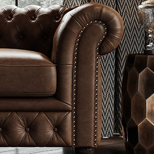 The exquisite Parma Full Aniline Leather Lounge is a true masterpiece of refined elegance. This stunning piece boasts button-tufted back cushions, beautifully accentuated by padded and tufted high-rolled arms and solid wood bun feet. The stately Bronze nail-head trim, intricately hand-applied, adds a final touch of sophistication as it outlines the arms and front rails. Immerse yourself in luxury with our grand three large-seater lounge, offering an expansive width to accommodate your every lounging desire. This Lounge exemplifies the perfect blend of exquisite craftsmanship, lasting comfort, and timeless elegance, making it an exceptional addition to your living space.