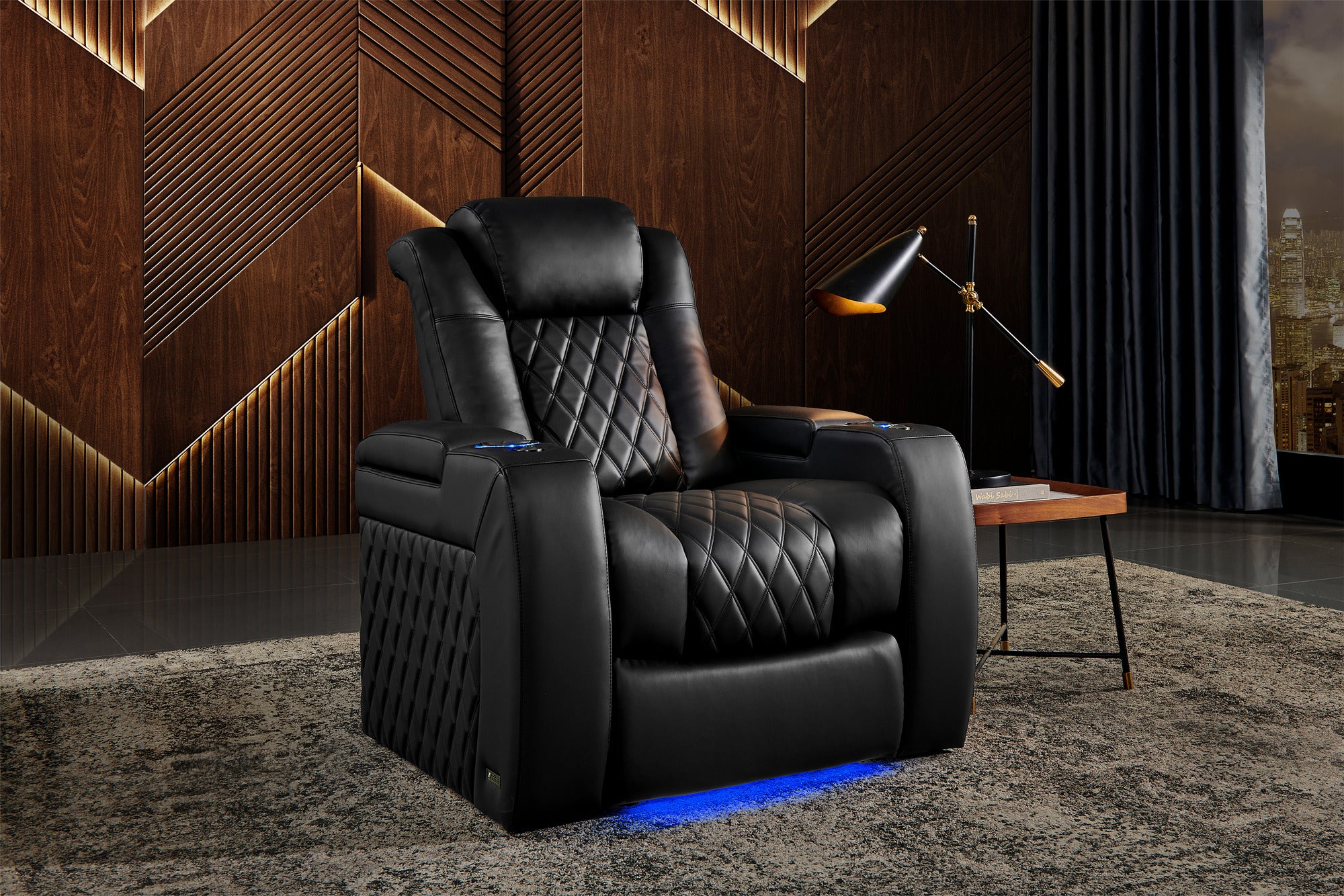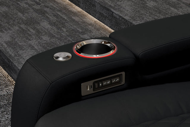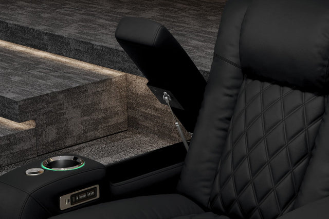- Armrest Hidden Storage with air pistons ensures smooth, seamless access to trays, remotes, and tablets.