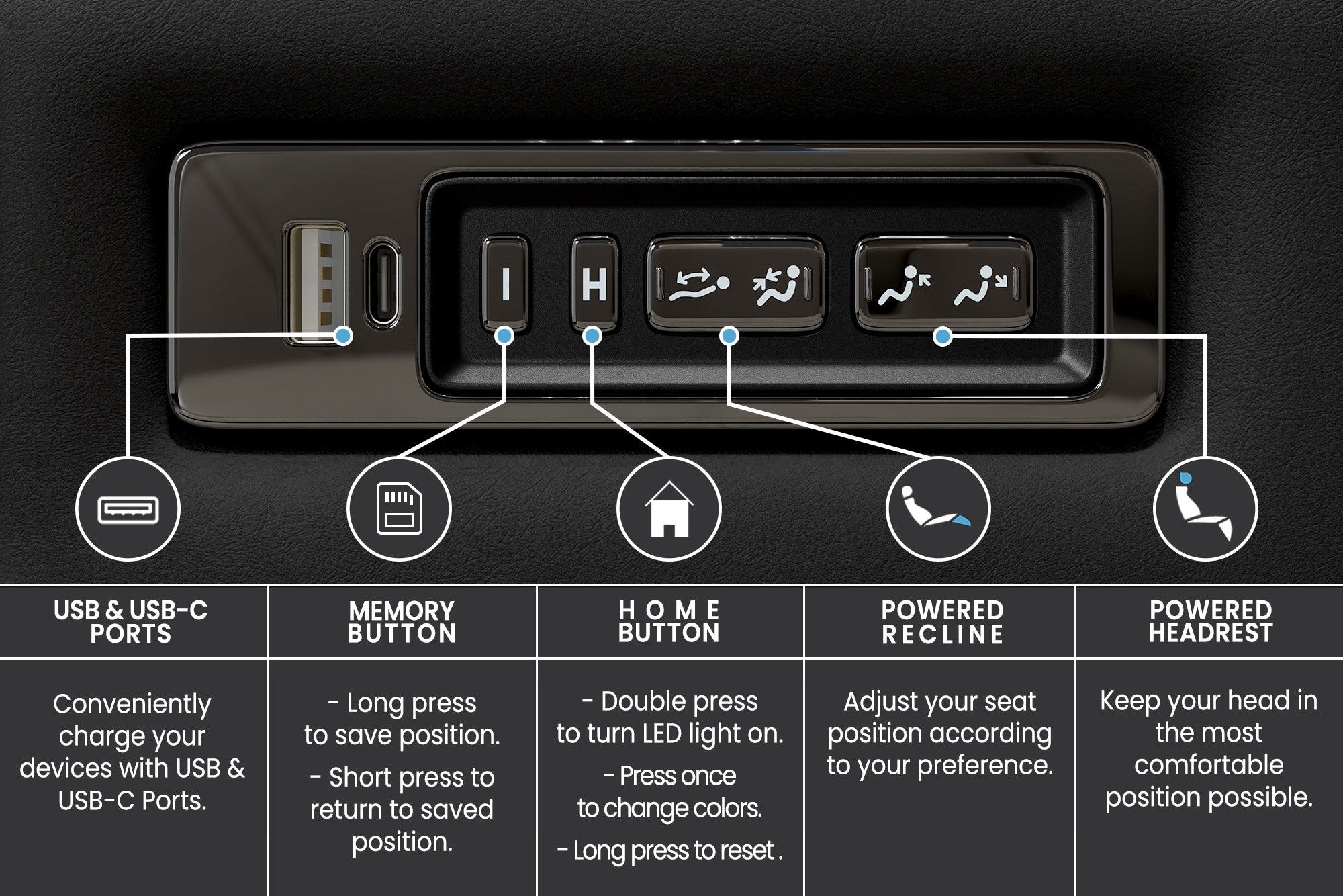 - Seat memory function recalls your perfect recline and headrest settings for effortless relaxation.