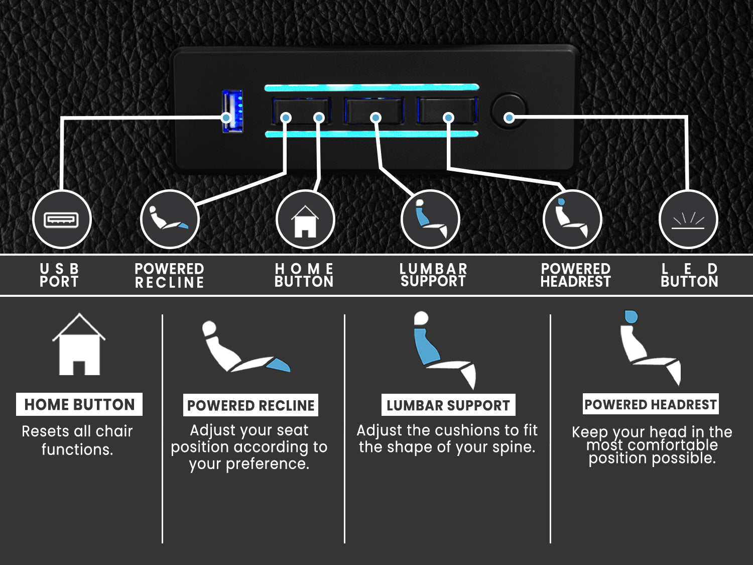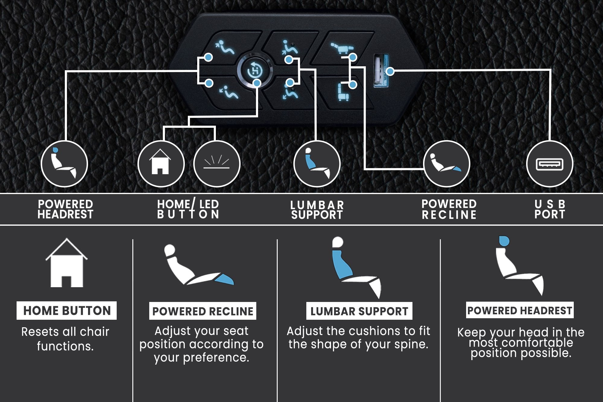- Power Headrest: Fully adjustable power headrest ensures ideal neck support in any reclining position.