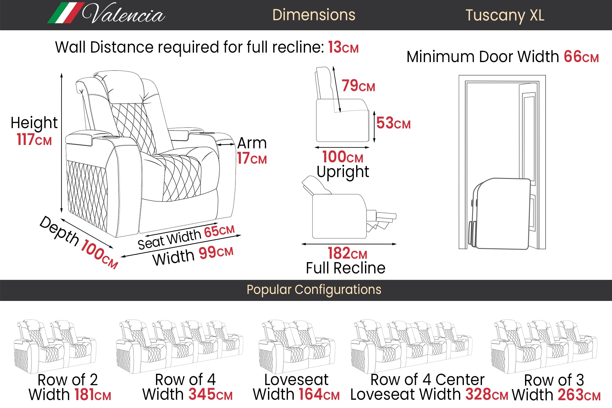 More space for more happiness. At Valencia Theater Seating, we want everyone to enjoy their movie night which why we developed our Tuscany XL series. This epic-sized chair is an upgraded version of Tuscany. It kept all the best features of the standard Tuscany but increased the seating space and weight capacity. If you are someone who wants more seating space, the Tuscany XL will take your movie experience to the next level.
